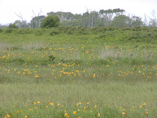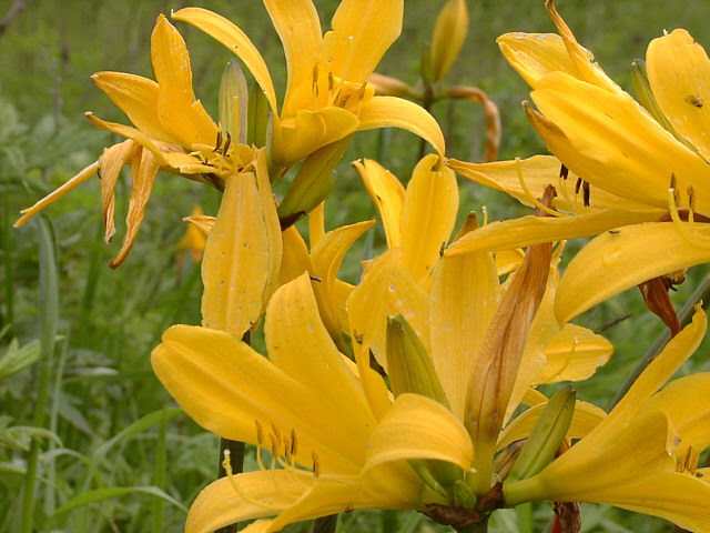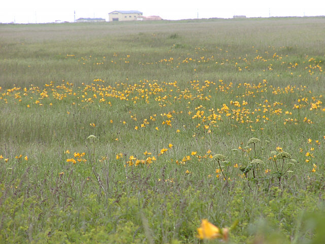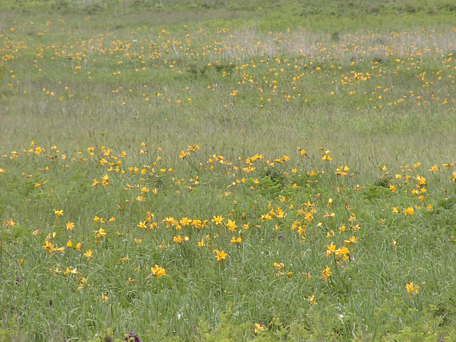 | 少し盛りをすぎた感じはありますが、それでも辺りを黄色く染めて咲いています。エゾカンゾウ。