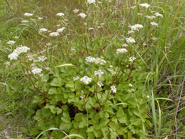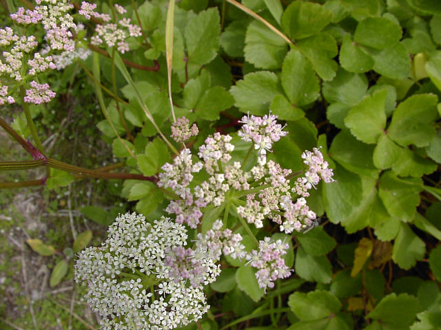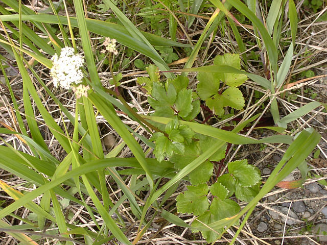 | マルバトウキの花が咲いていました。海岸に生えます。丸葉当帰。同じセリ科で野付半島にあるエゾノシシウドと比べると小型で繊細な感じがします。 野付半島にて。 |