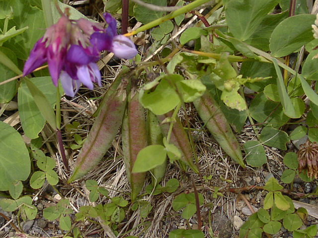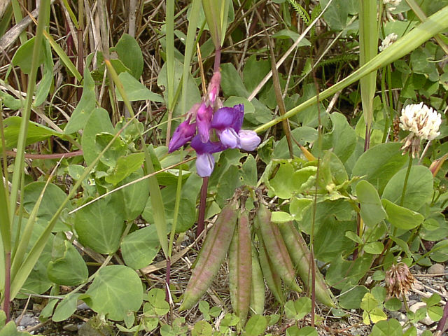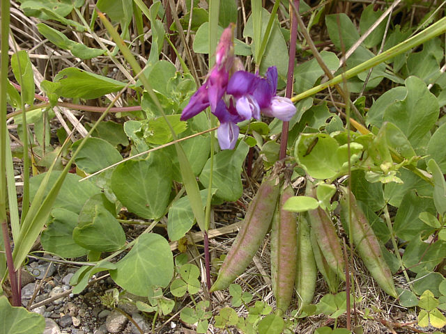 | ハマエンドウ。花も咲いていましたが、大きな実を重そうにつけていました。浜豌豆の名にぴったりのエンドウ豆のような実です。 野付半島にて。 |