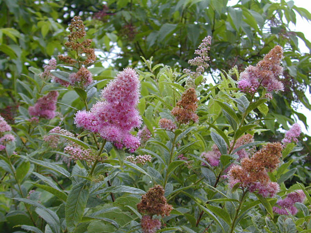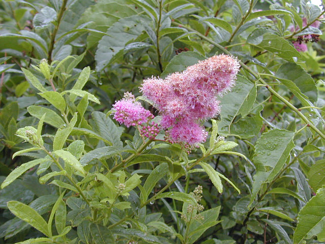 | ホザキシモツケ。バラ科の落葉樹です。湿原の周辺に生える。ピンク色の花が美しい。 ポー川史跡自然公園にて。 |