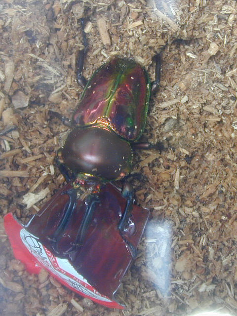 ![]() クワガタムシとは思えない、形態と色彩をしています。昆虫ゼリーに夢中のオス。 |