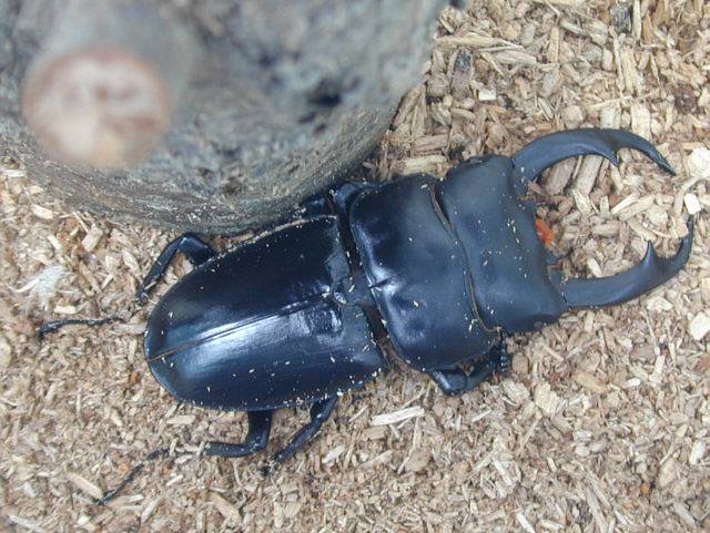 | 現在、サーモン科学館にて「世界のクワガタ・カブトムシ展」が行われています。(8月26日まで) 近年、国内産のオオクワガタの人気が高まっていますが、それにともない、外国産オオクワガタもたくさんの種類が日本に輸入されています。このオオクワガタの原産地は中国、台湾です。 標津サーモン科学館にて。 |