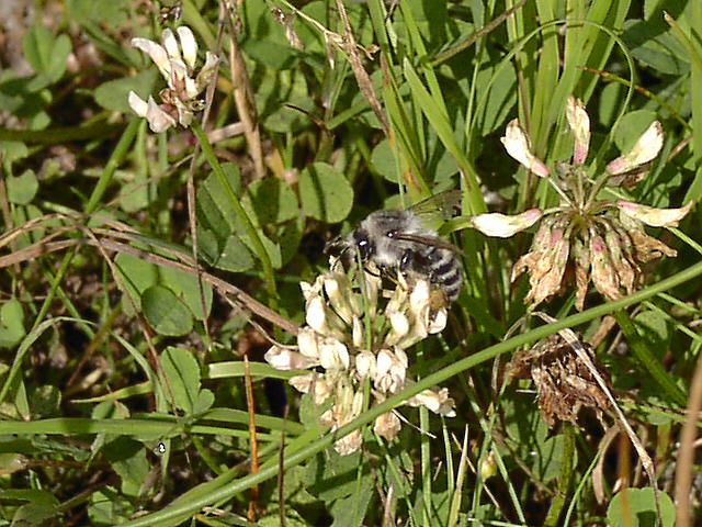 | ハイイロマルハナバチか、ニセハイイロマルハナバチがいました。名前のように灰色の毛が生えています。北海道の低地に分布しています。 野付半島にて。 |