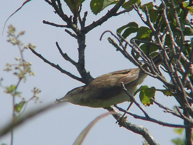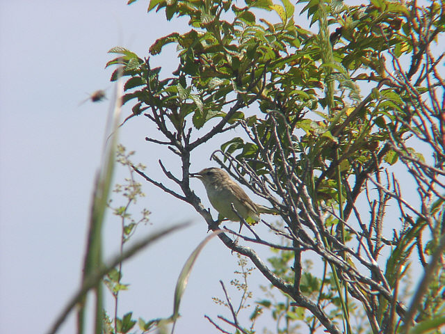 | 餌をくわえたコヨシキリ。まだ子育て中なのでしょう。 この後、近くの薮に入りました 野付半島にて。 |
