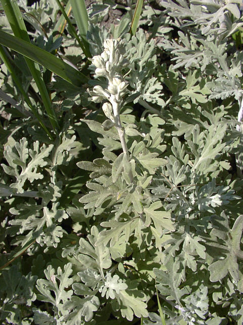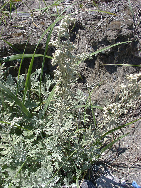 | つぼみをつけたシロヨモギ。名前のように白っぽく見えるヨモギの仲間です。海岸の砂地に生えます。 白蓬。キク科。 野付半島にて。 |