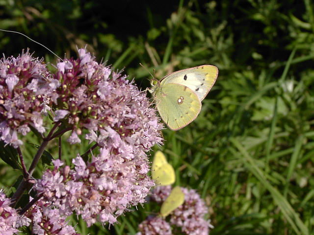 | モンキチョウがオレガノ(ハーブ)の花にきていました。全国で普通に見られ、黄色地に紋のある翅が楽しいチョウです。メスは白色をしています。 |