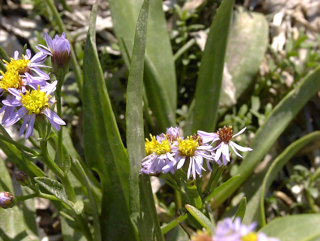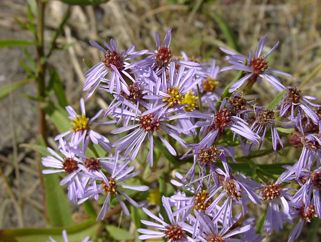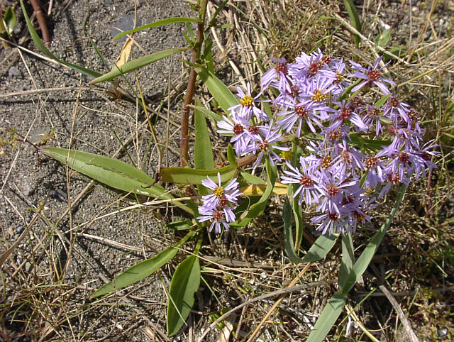 | ウラギクの花が咲いています。甘い良い香りがします。漢字は浦菊。海岸に生えるキクの仲間。 別名ハマシオン。葉は厚みがあります。 野付半島にて。 |
