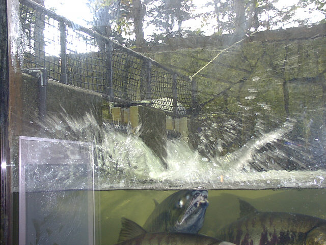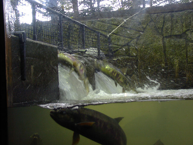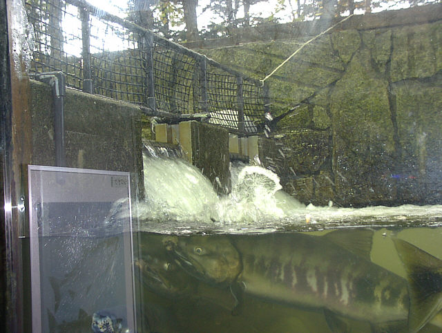 | サーモン科学館の魚道水槽では、現在遡上してきたシロザケを間近に観察できます。ジャンプするシロザケの様子。 サーモン科学館 にて。 |