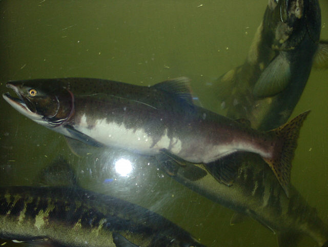 | 魚道水槽のカラフトマス。シロザケよりも遡上時期が早いカラフトマスは数が少なくなってきています。 サーモン科学館 にて。 |