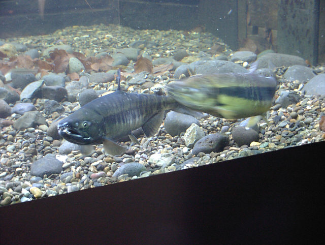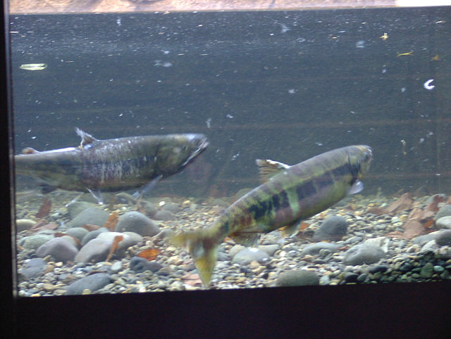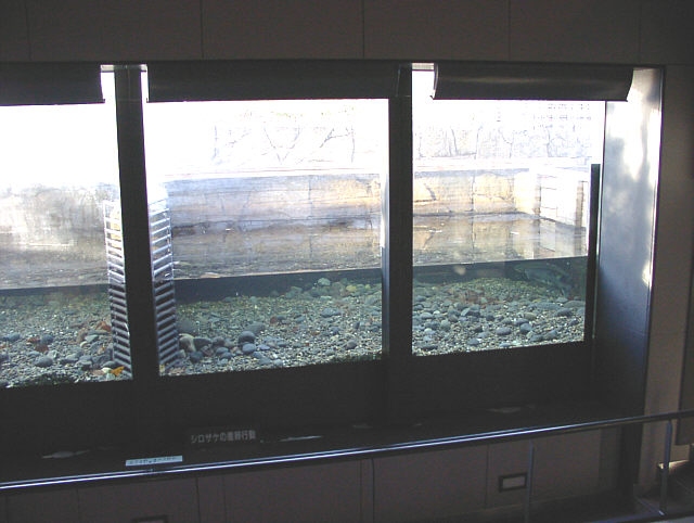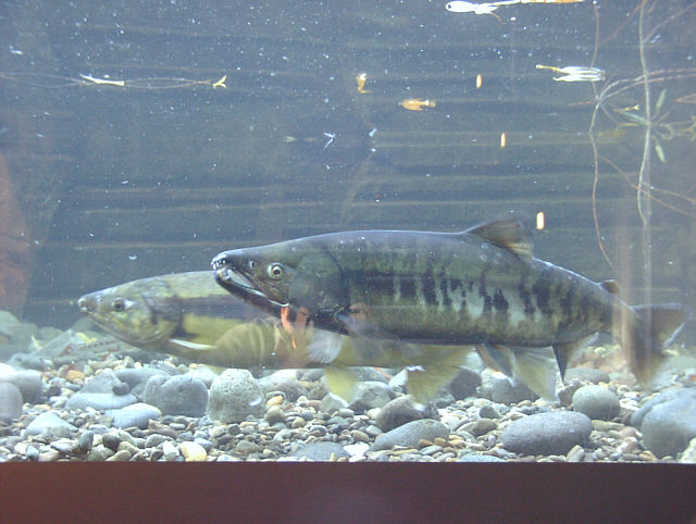| シロザケの産卵行動を展示しています。 標津サーモン科学館にて。 |