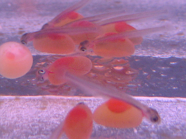 | シロザケの赤ちゃん。孵化したばかりのものです。しばらくはお腹の栄養をつかって成長します。 標津サーモン科学館にて。 |