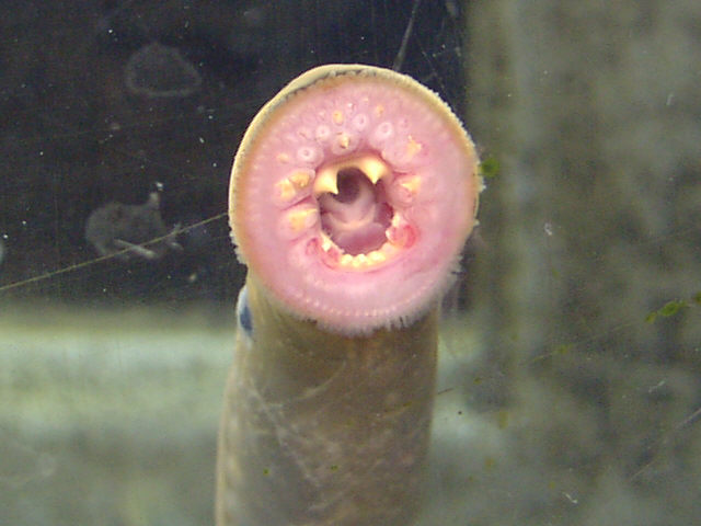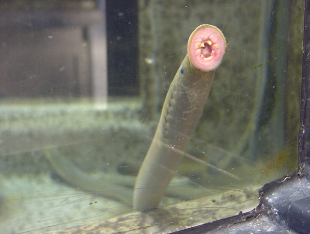 | カワヤツメが水槽に吸い付いていました。1対の目と7対あるエラ穴が、まるで目が8対あるように見えるとこからヤツメウナギ。 標津サーモン科学館にて。 |