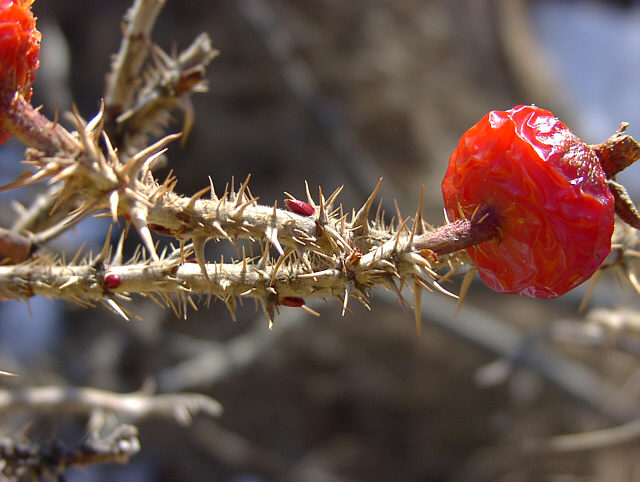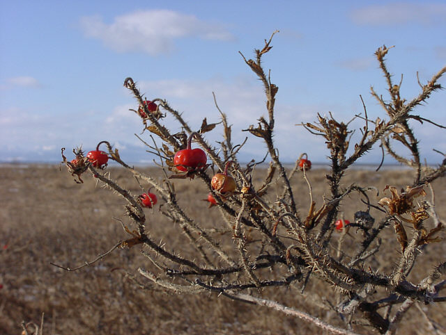 | ハマナスの実がまだ枝先にありました。 おいしそうに見えるのですが、鳥や動物に食べ残されているようです。 野付半島にて。 |