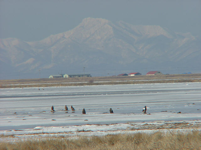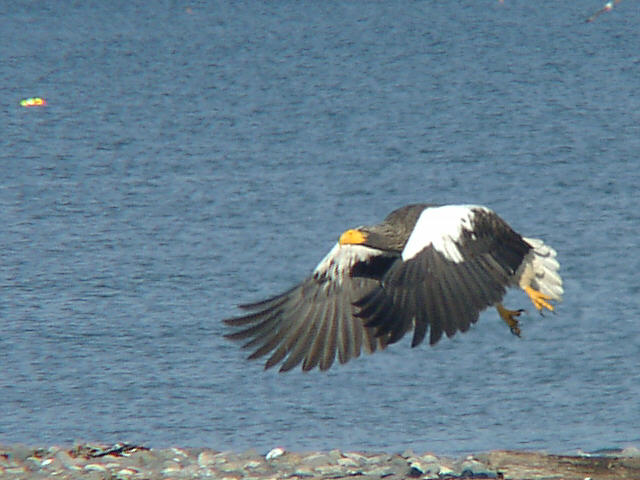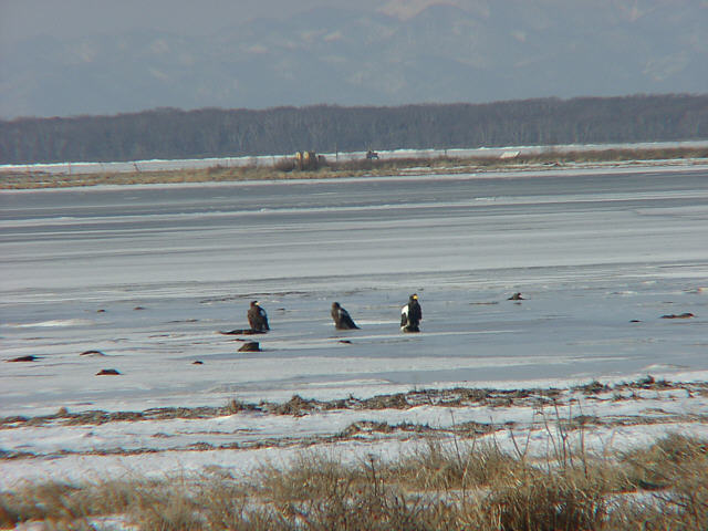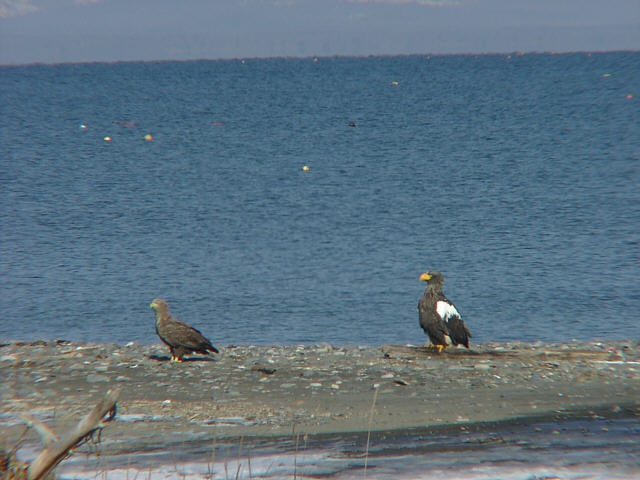 | 野付半島周辺のオオワシは漁船の帰る海岸に付近に集まっておこぼれを待ちます 氷の上にじっとたたずむ姿は彫像のように見えます |