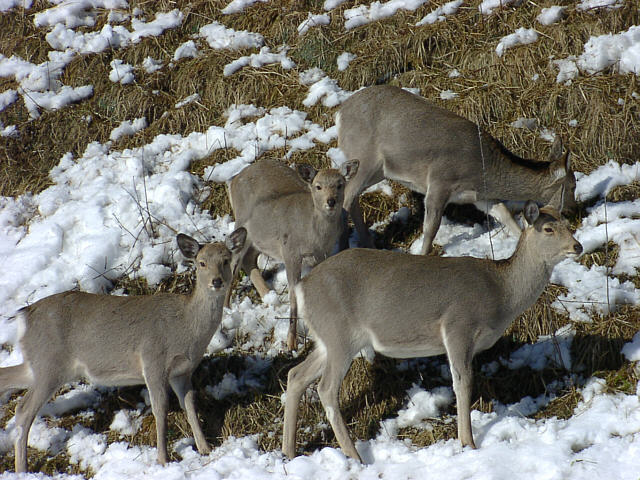 | エゾシカがいました。条件の良い南斜面の草地にはメスと子ジカの群がたくさんいます オスは断崖の上や雪深い山の中など条件の厳しいところにいます。 |