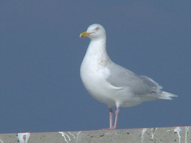 | 野付半島では、シロカモメの個体数がオオセグロカモメと比べて多い。(知床半島では、シロカモメよりもオオセグロカモメが多い。) シロカモメは全体に白っぽく、特に翼の先が白いのが特徴。大型カモメ類の中でも特に大きい。 野付半島にて。 |