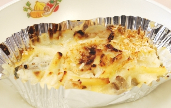 - アルミカップに具を入れてパン粉と粉チーズをふり、オーブンに入れる。